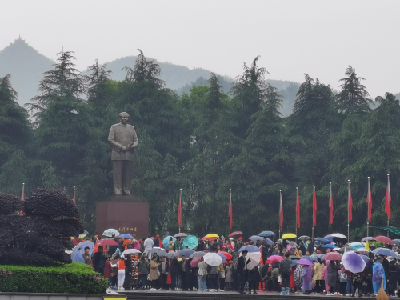 第二天,韶山下起了小雨, 然而寒風(fēng)冷雨仍然難以阻擋來韶山游客的熱情,在毛澤東廣場,游客打著雨傘、披著雨衣給毛主席銅像敬獻(xiàn)花籃。毛澤東廣場位于韶山?jīng)_中心,距毛主席故居和紀(jì)念館都很近。